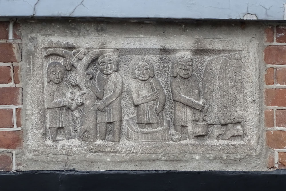 Deze 20e- eeuwse gevelsteen toont het proces van wijnbereiding. Links worden de druiven geplukt, in het midden worden ze geperst, en rechts wordt wijn uit het vat getapt. Bij het maken van wijn wordt druivensap via verschillende vergistingsprocessen omgezet in most, en most in wijn. Het persen van de druiven gebeurde vroeger met blote voeten in een grote kuip. Dat had als voordeel dat de pitten onbeschadigd bleven.