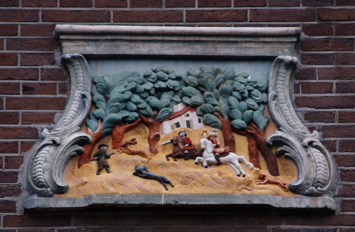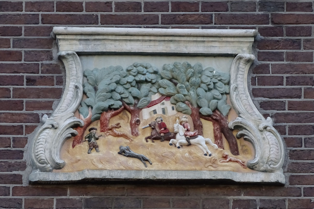 Een gevelsteen (formaat: 70x 95cm) met een bebost landschap met twee jagers te paard die een hert achtervolgen. Op de voorgrond een hond en links een man met een speer. De rechter ruiter blaast op een hoorn. De steen is uit de eerste helft van de 18e eeuw. Aan de zijkanten in- en uitgezwenkte voluten in Lodewijk de XIV- stijl.
