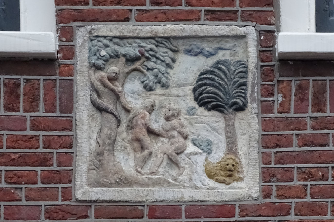 De voorstelling op de steen, met de unieke menselijke slang met twee armen die Eva de appel aanreikt, is ontleend aan een gravure van Pieter van der Borgt in een prentbijbel uit 1613 (uitgegeven door Michiel Colijn in Amsterdam). De palmboom en de leeuw zijn eigen toevoegingen van de steenhouwer. Op de andere Amsterdamse gevelsteen met de paradijsvoorstelling zijn Adam en Eva meer traditioneel ter weerszijden van de boom weergegeven. In juli 1990 is het reliëf door Jos Otten van dikke lagen verf ontdaan en in ‘natuurlijke’ kleuren geschilderd.